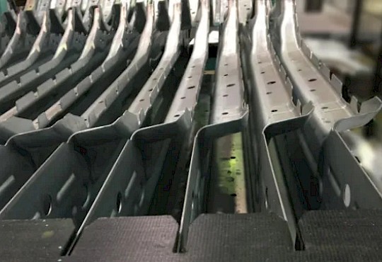 Der Arbeitsprozess, den FrameSense automatisieren soll, kommt in zahlreichen Produktionsabläufen vor. Ein Bauteil verlässt dabei eine Maschine - in diesem Fall eine Presse - und wird über ein Förderband zu einem Behälter transportiert, in dem es gestapelt wird. Ist der Container vollständig gefüllt, wird er zum nächsten Fertigungsschritt weitergeleitet, etwa zur Montage in einem Fahrzeug.