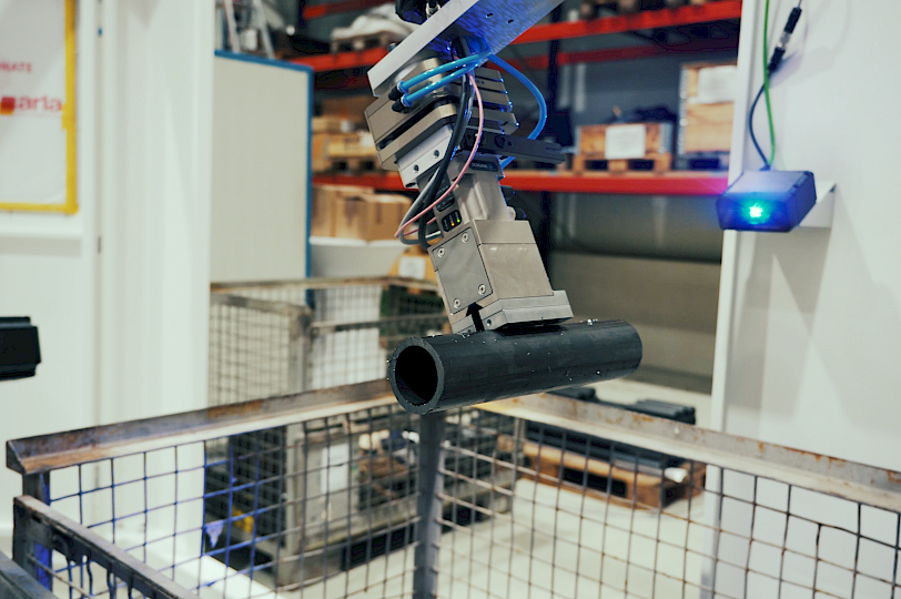 Schwierigkeit: Sägespäne haften an den Werkstücken an. Die Greiftechnik muss also nicht nur flexibel genug für verschiedene Werkstücke sein, sondern auch während des Greifvorgangs Späne abblasen können.