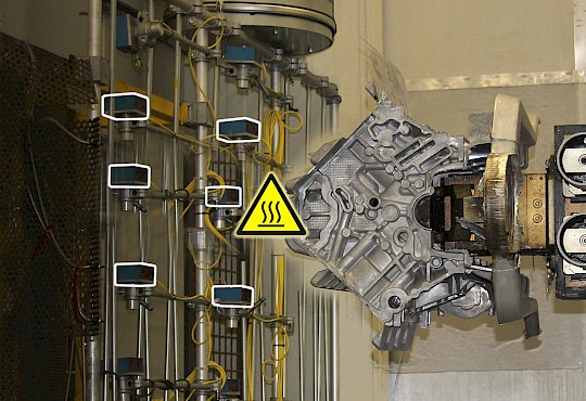 Bisher kamen für diese Aufgabe häufig klassische Sensoren wie Lichtschranken, induktive Sensoren oder Reflexionslichttaster zum Einsatz. Diese müssen jedoch in unmittelbarer Nähe zum heißen Werkstück positioniert werden, wodurch sie hohen thermischen Belastungen ausgesetzt sind. Zudem besteht die Gefahr von Kollisionen mit den Bauteilen. Ein weiterer Nachteil ist der hohe Umrüstaufwand: Bei Typ- oder Werkzeugwechseln müssen Sensoren oft neu ausgerichtet, ergänzt oder angepasst werden, was zu Stillstandzeiten und zusätzlichem Aufwand führt.